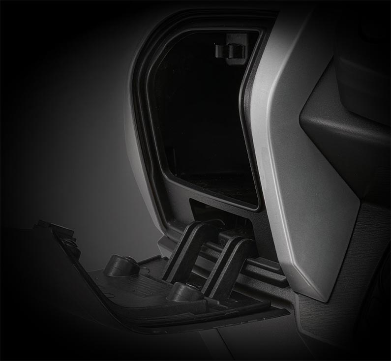 Pod řídítky ATR 125 jsou dvě odkládací schránky, které Vás mile překvapí svou velikostí. Do každé z nich se pohodlně vejde i PET láhev s pitím, nebo jakékoliv další osobní věci jezdce a spolujezdce. Nemusíte tedy převážet Vaše drobné věci, peněženky a nebo doklady po kapsách. V pravé schránce jsou chytře umístěné napájecí zásuvky USB-A a USB-C.