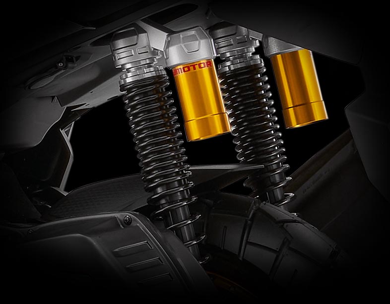 Dvojice zadních tlumičů s nastavitelným předpětím pružiny (5 pozic) nabízí velmi příjemnou jízdu s maximálním pohodlím. Podvozek skvěle filtruje nerovnosti vozovky, zatímco tlumení příkladně udržuje pneumatiky ATR 125 v kontaktu s vozovkou jak na suchu, tak i v mokrých podmínkách.