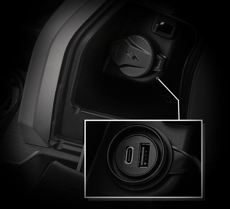 V pravé příruční schránce pod řídítky je integrována zdvojená zásuvka USB-A a USB-C. Můžete skrz ně nabíjet například mobilní telefon, nebo si též zapojit externí navigaci. USB zásuvky mají samozřejmě voděodolnou gumovou krytku.